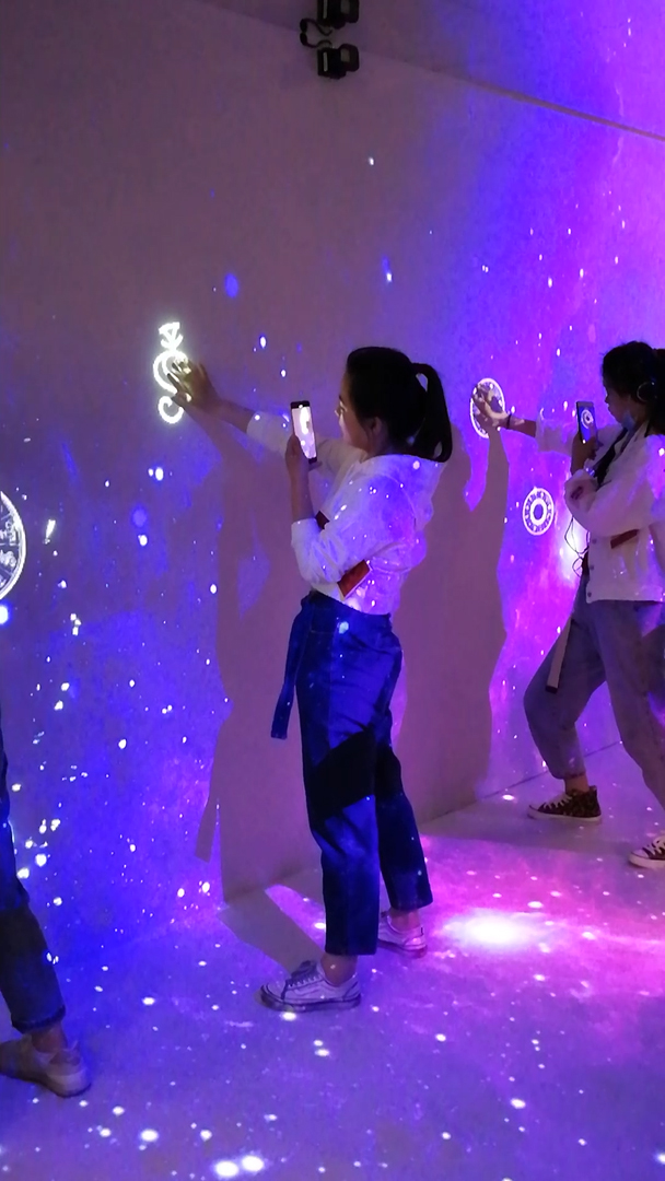 沉浸式互动利用投影机将画面投射到大型或者多面的投影幕上,然后再借助多通道投影融合技术使得画面能够呈现出更好的效果。该系统能够提供一个房间大小的四面(或六面)立方体投影显示空间,再结合音响系统和动作采集系统,制造一个沉浸式的立体三维视听的交互体验感。将影像投射四周墙上和地上,配合3D主题游戏内容,打造3D立体空间,并且与影像的主题内容进行互动,如动物,人物,花草等,让顾客,产生身临其境的感觉,增加了感官体验以及场景互动性