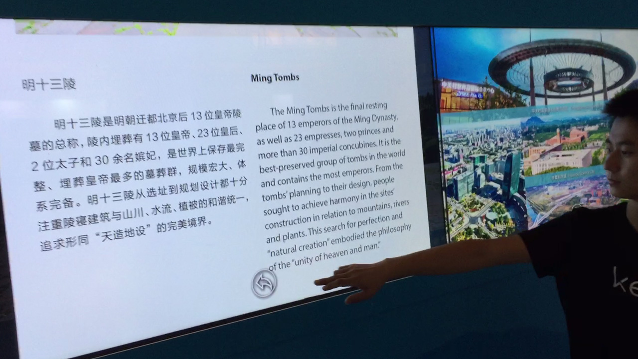 触摸系统自动感应是否有体验人员进入互动区域,没有人的情况下,系统循环播放广告视频或者动态效果演绎、一旦有人进入指定空间后,屏幕自动向两边打开,显示触控界面,系统允许多人同时操作。